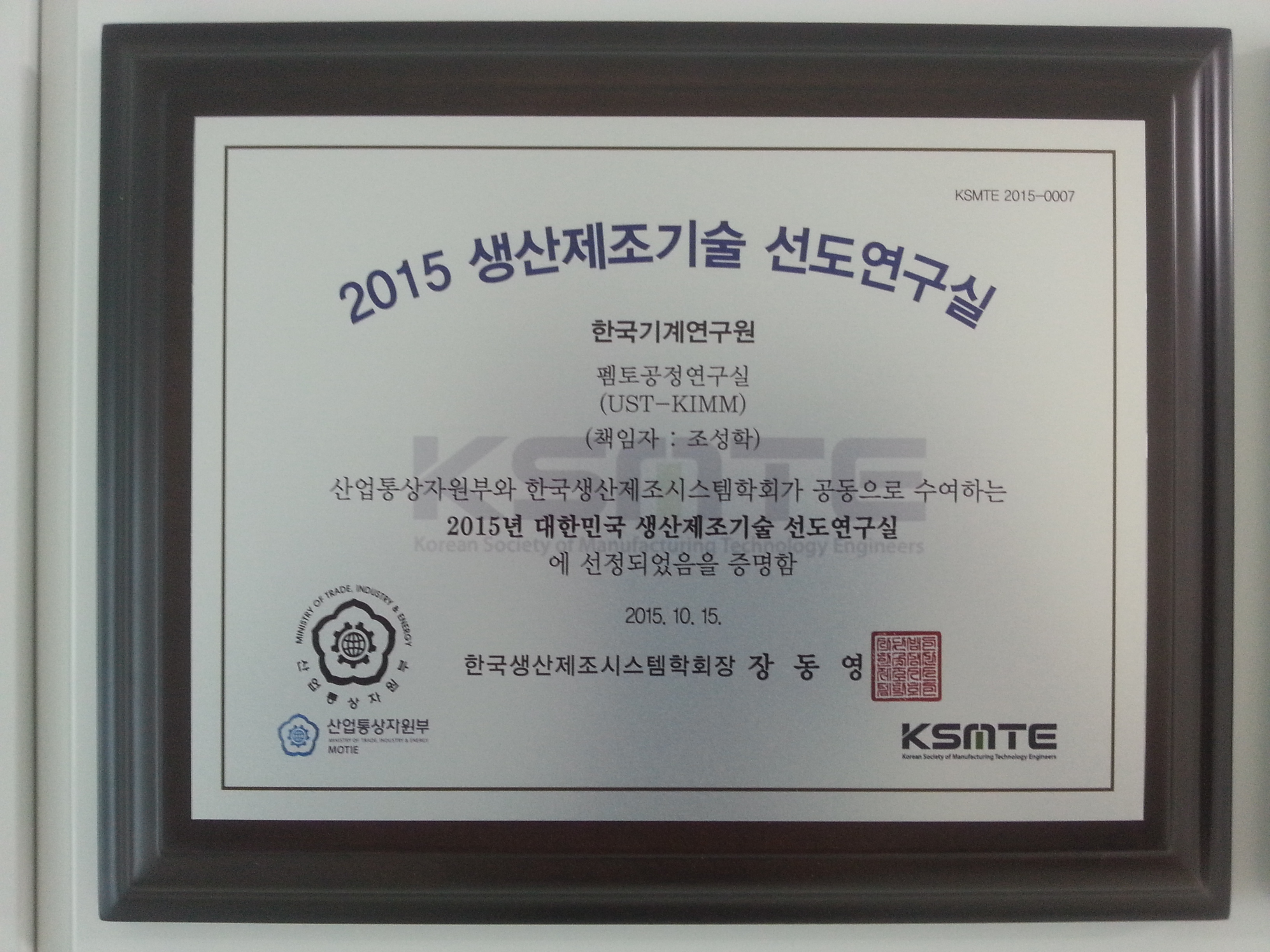 7. ´ëÇѹα¹ »ý»êÁ¦Á¶±â¼ú ¼±µµ¿¬±¸½Ç ¼±Á¤ (2015.10.15, »ê¾÷Åë»óÀÚ¿øºÎ, KSMTE¼±Á¤)