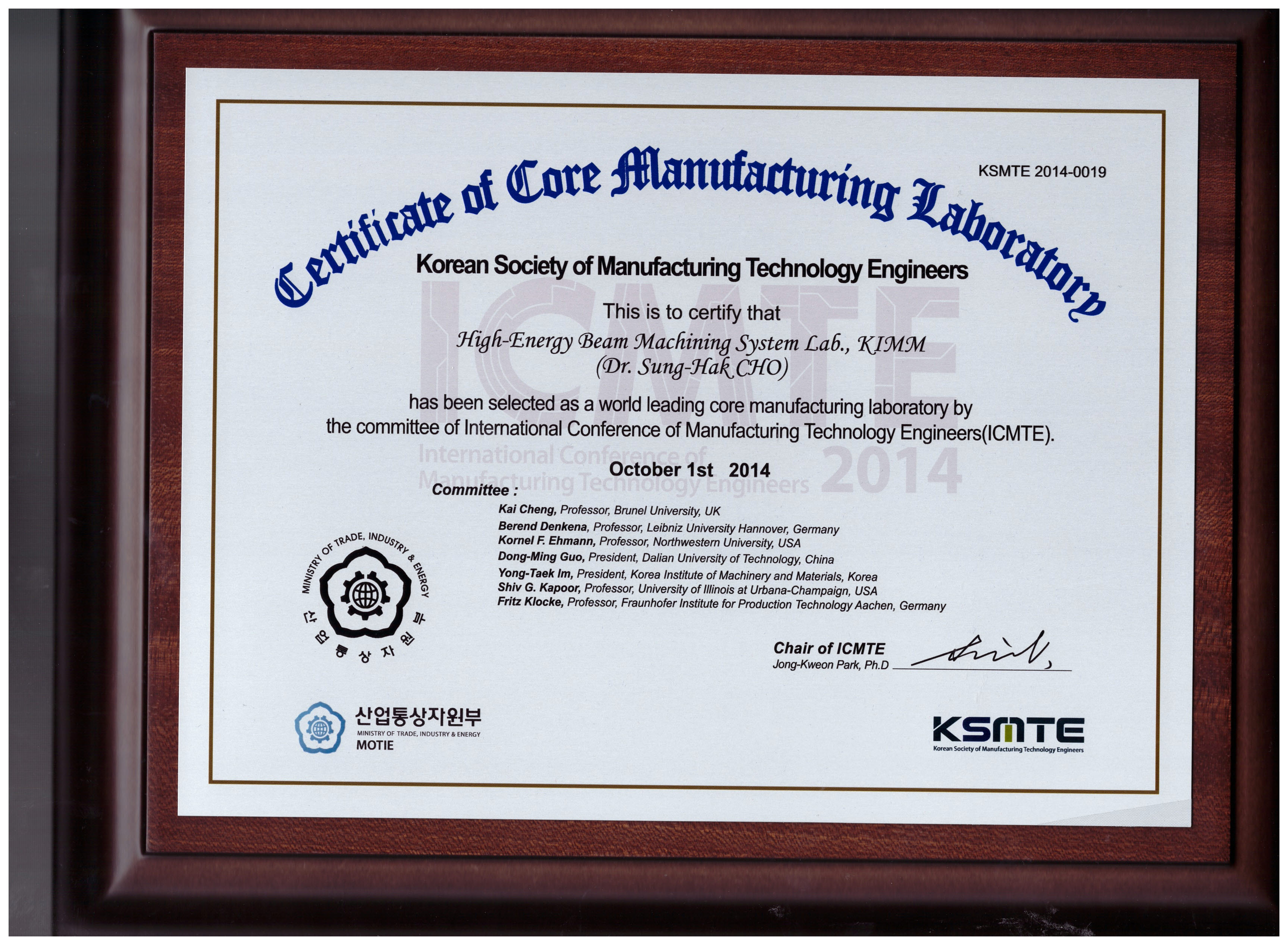 6. Certification of Core Manufacturing Laboratory ¼±Á¤ (2014.10.1, »ê¾÷Åë»óÀÚ¿øºÎ, KSMTE¼±Á¤)