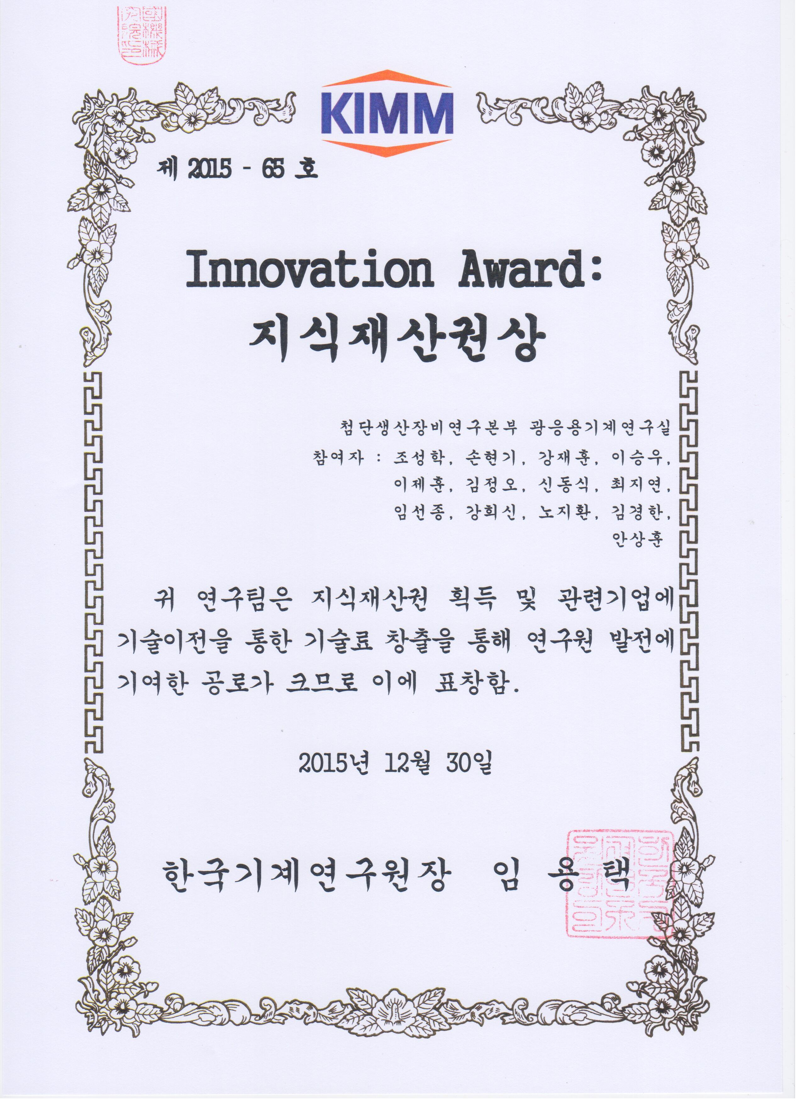 10. Çѱ¹±â°è¿¬±¸¿ø Inovation Award Áö½ÄÀç»ê±Ç»ó (2015³â 12¿ù 30ÀÏ)
