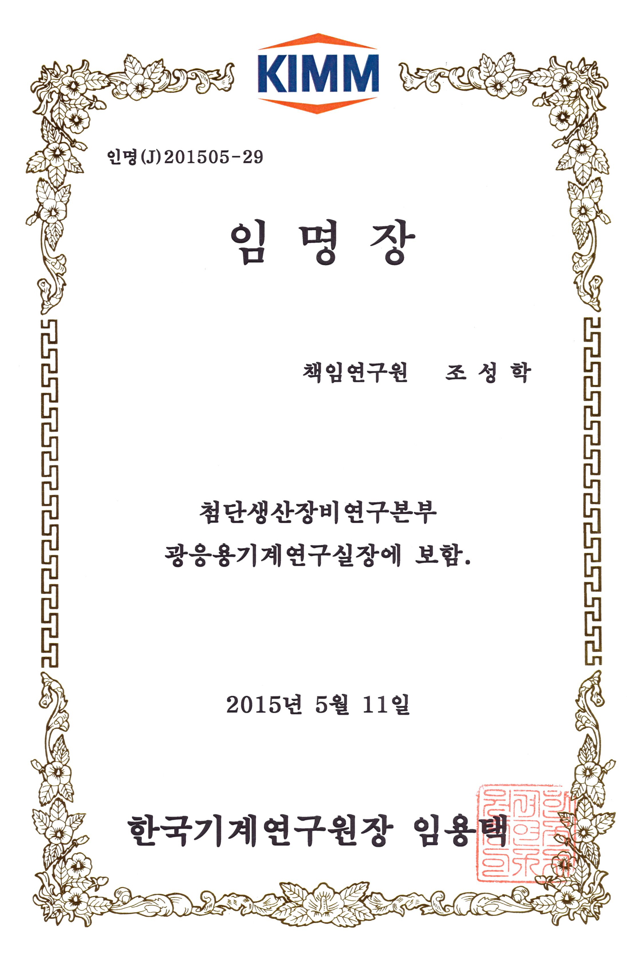 9. Çѱ¹±â°è¿¬±¸¿ø ±¤ÀÀ¿ë±â°è¿¬±¸½Ç ¿¬±¸½ÇÀåÀ¸·Î ÀÓ¸í (2015³â 5¿ù - )