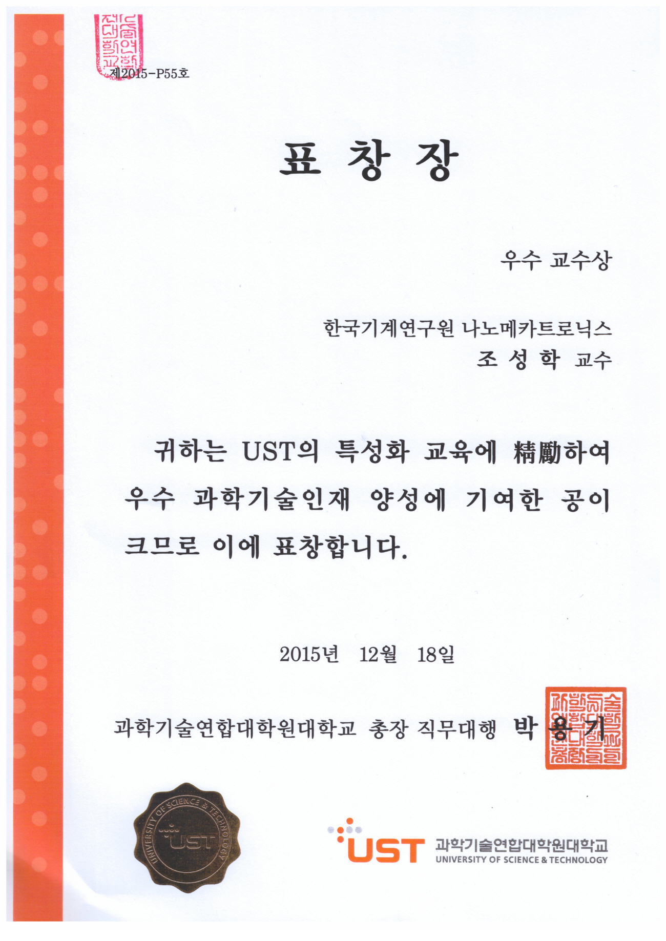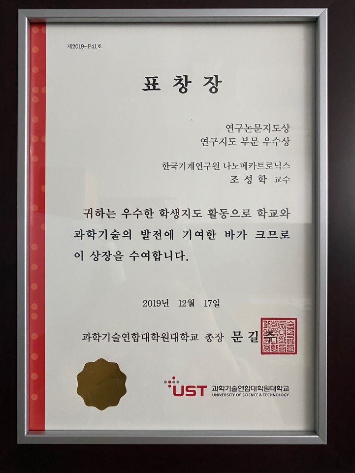 4. ¿ì¼ö±³¼ö»ó ¼ö»ó (Çѱ¹°úÇбâ¼ú¿¬ÇÕ´ëÇпø (UST) 2015³â 12¿ù 18ÀÏ), »ó±Ý150¸¸¿ø 2ȸ¼ö»ó