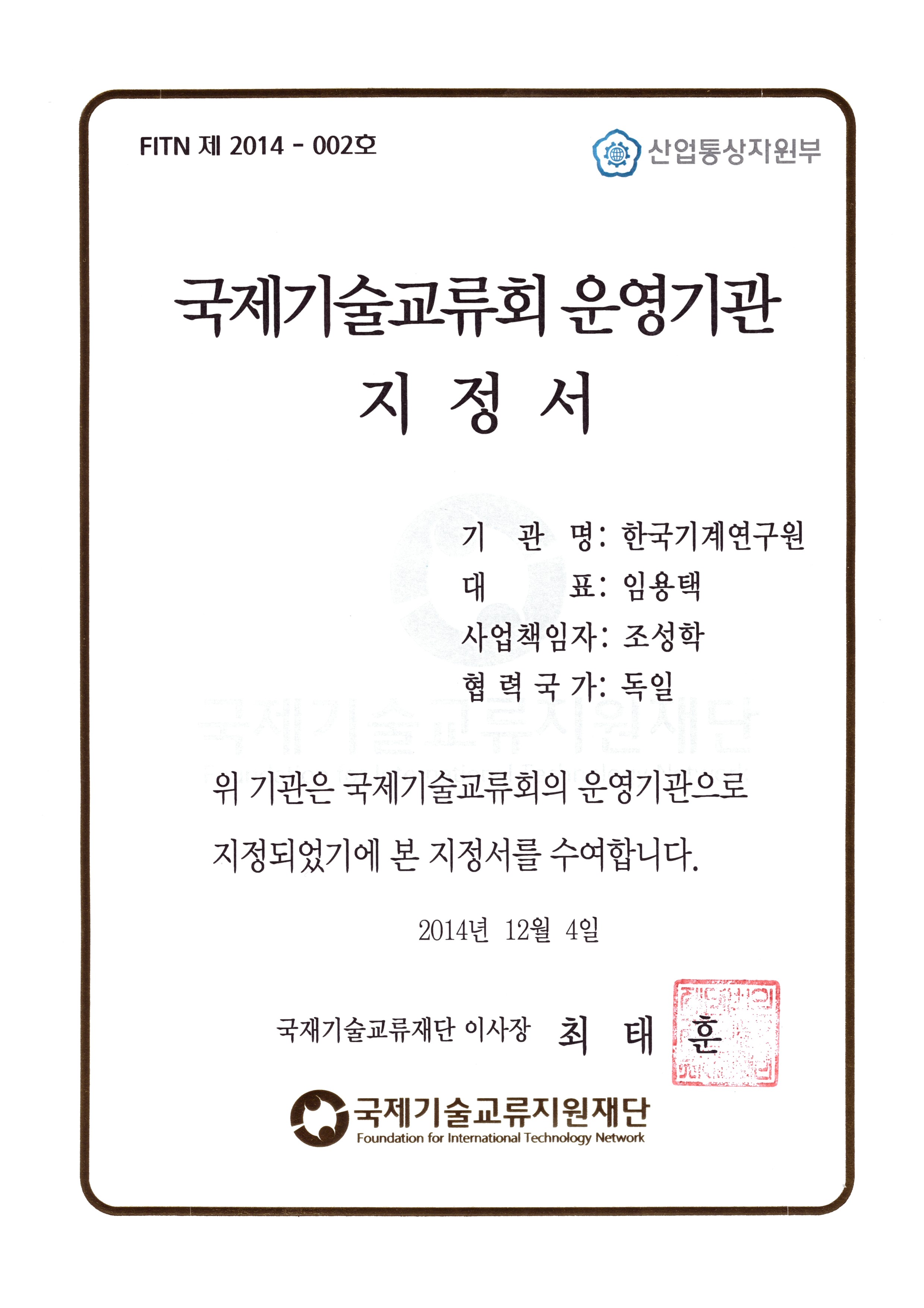 8. Çѱ¹-µ¶ÀÏ ±¹Á¦±â¼ú±³·ùȸ (·¹ÀÌÀú »ý»êÁ¦Á¶ºÐ¾ß) ÁÖ°ü¿î¿µ±â°ü ÁöÁ¤ (2014.12.4. »ê¾÷Åë»óÀÚ¿øºÎ,±¹Á¦±â¼ú±³·ùÀç´Ü ¼±Á¤)