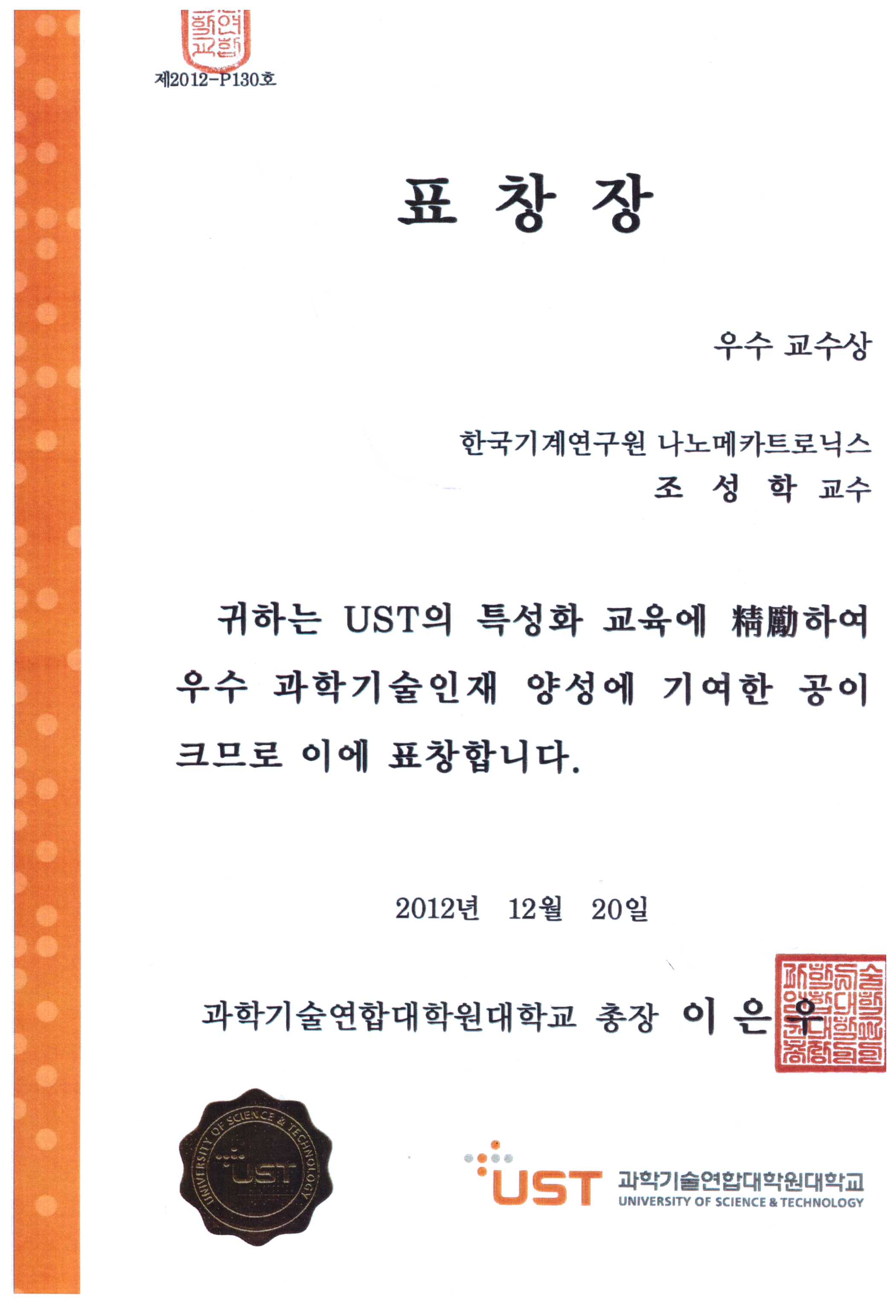 3. ¿ì¼ö±³¼ö»ó ¼ö»ó (Çѱ¹°úÇбâ¼ú¿¬ÇÕ´ëÇпø (UST) 2012³â 12¿ù 20ÀÏ), »ó±Ý 150¸¸¿ø