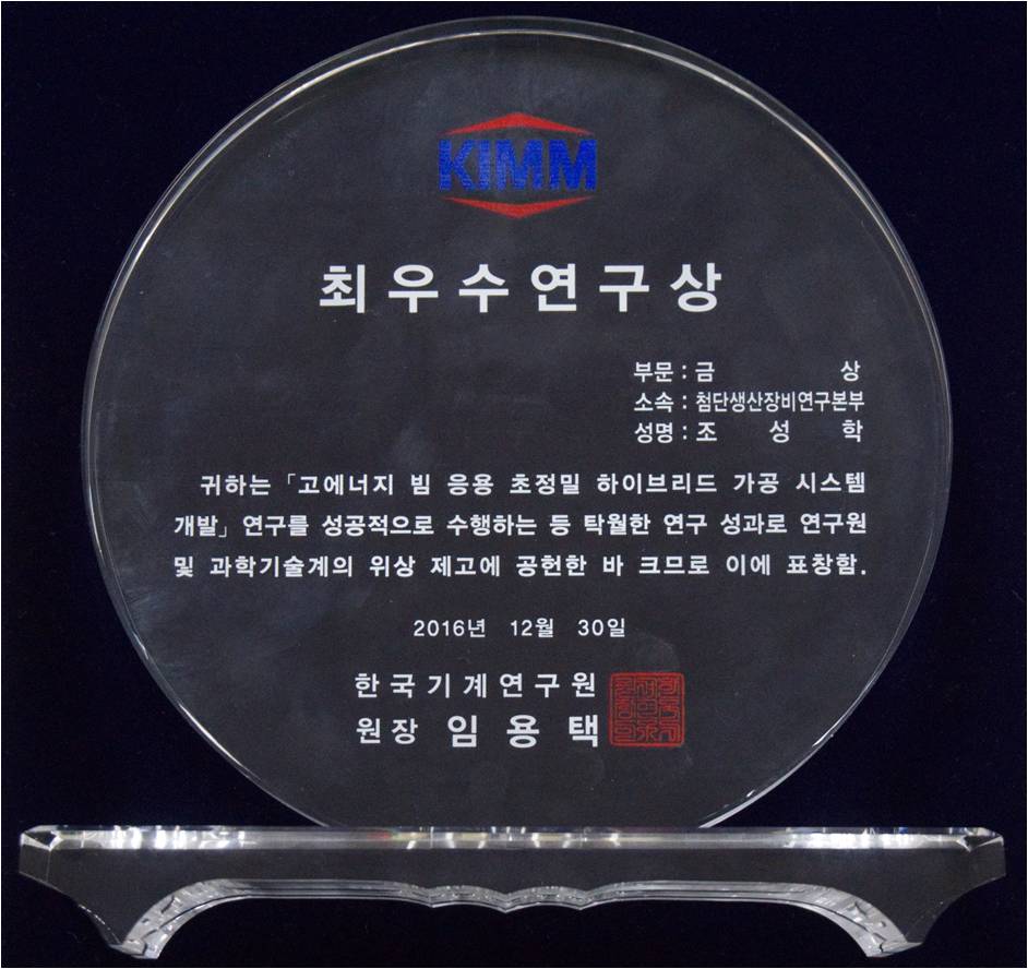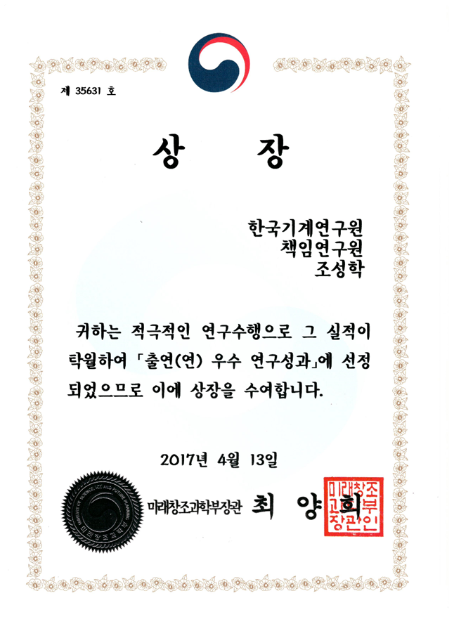 11. Çѱ¹±â°è¿¬±¸¿ø ÃÖ¿ì¼ö¿¬±¸»ó ¼ö»ó(»ó±Ý 1,000¸¸¿ø, 2016³â 12¿ù 30ÀÏ)